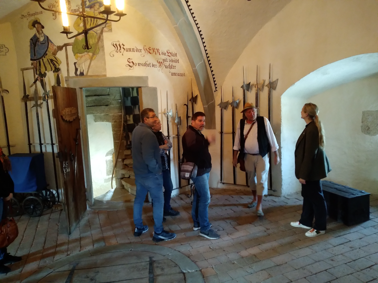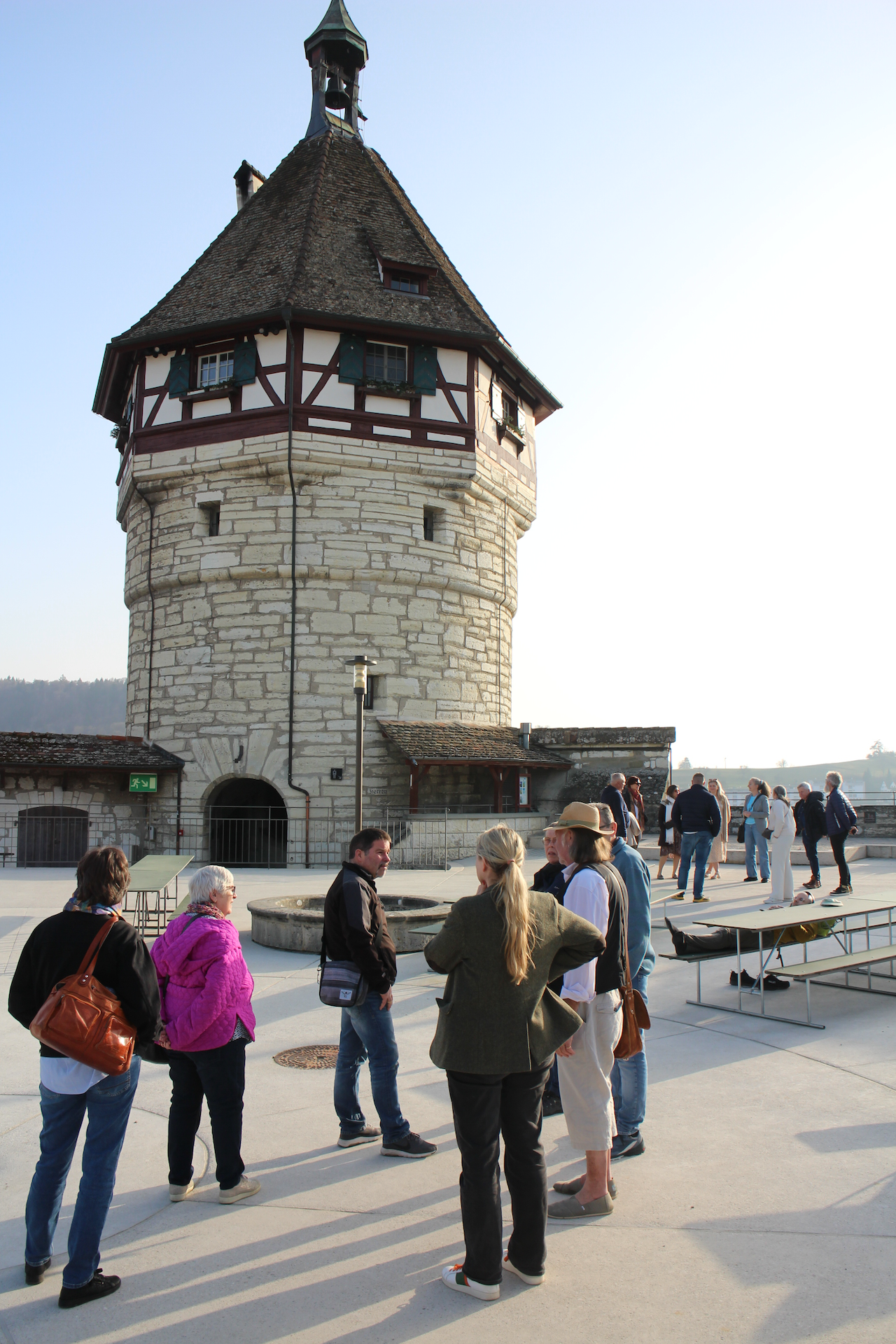 Ein Verdauungsspaziergang führte uns auf den Munot zur Festungsanlage aus dem 16. Jahrhundert. Die Festung ursprünglich „ohne Not“ benannt, wurde zum Treffpunkt für die Bevölkerung und ist es bis heute. Daher die Namensänderung: Wo trifft man sich? Uff „m unot“. Unser Guide Raffi führte uns ins Untergeschoss, in die Waffenkammer, zum Aussichtspunkt und entlang des Wehrgangs und hatte viele Geschichten zu erzählen und zeigte uns auch Gänge und Räume, die bei Standardführungen verschlossen bleiben.