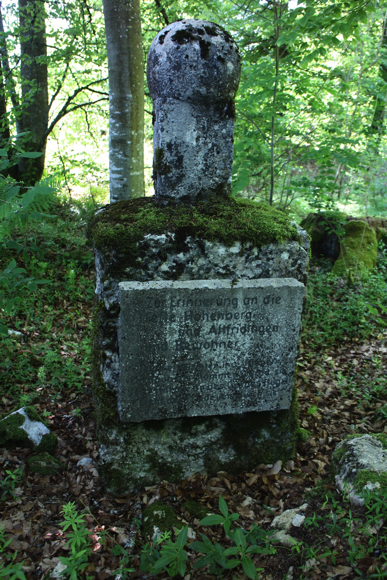 Über dem Weg am ehemaligen Eingangstor der Anlage, die wir heute Ruine Altfridingen nennen, steht ein eigenwilliger Gedenkstein für diese einst mächtige Burganlage und ihre Bewohner. Er wurde um 1910 auf Veranlassung des 1835 in Fridingen geborenen Oberlehrers Franz-Xaver Hamma gesetzt, der sich um die Erforschung der Familiengeschichte der Hamma sehr verdient gemacht hat.