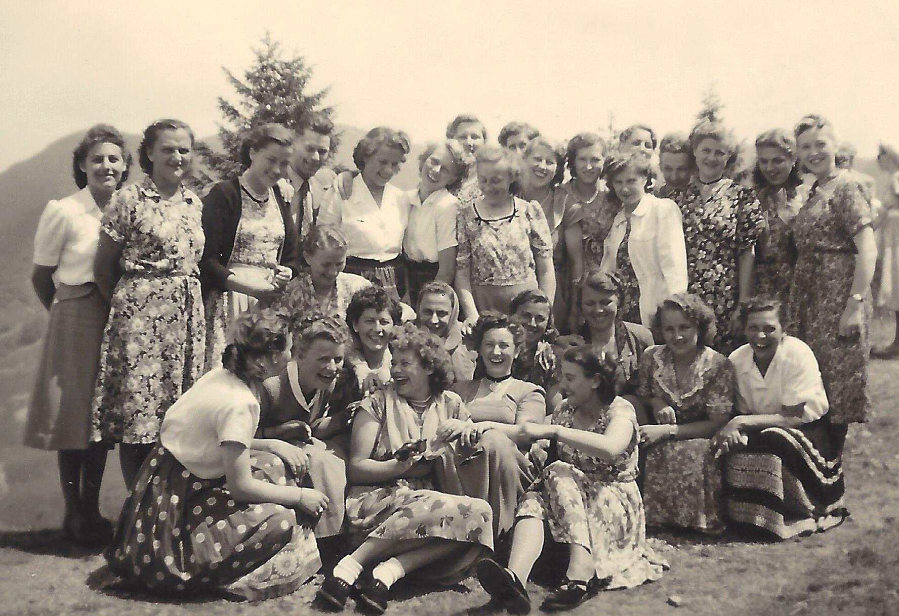 Bild – Betriebsausflug der Strickerei im Schloss: Die beiden Bücher sind reich illustriert. Oftmals stellt sich bei den Bilder die Frage: „Wer ist Flüchtling, Ausgewiesener oder Heimatvertriebener? Wer ist Einheimischer?“ Oder wie bei diesem Bild: „Wer sind die zwei Männer auf dem Bild?“ Selbstverständlich werden diese Fragen in den beiden Buchbänden beantwortet.