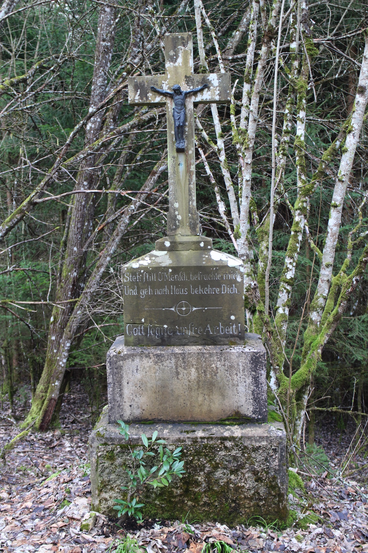 Am Donautalweg von Fridingen ins Jägerhaus steht etwa dreihundert Meter vor der Abzweigung zum Scheuerlehof, links etwas unterhalb des Weges, ein Kreuz mit Korpus auf einem wuchtigen dreistufigen Sockel. Es befindet sich schon auf Buchheimer Markung und steht hart am ehemaligen Fußweg vom Schänzlefelsen zum Scheuerlehof. Das Kreuz aus Sandstein wurde im Jahr 1910 aufgestellt von Max Hipp (1877-1945) und seiner Frau Regina, geb. Hermann (1881-1957) aus Fridingen, die von 1902 bis 1914 Pächter des Hofgutes Scheuerle waren.