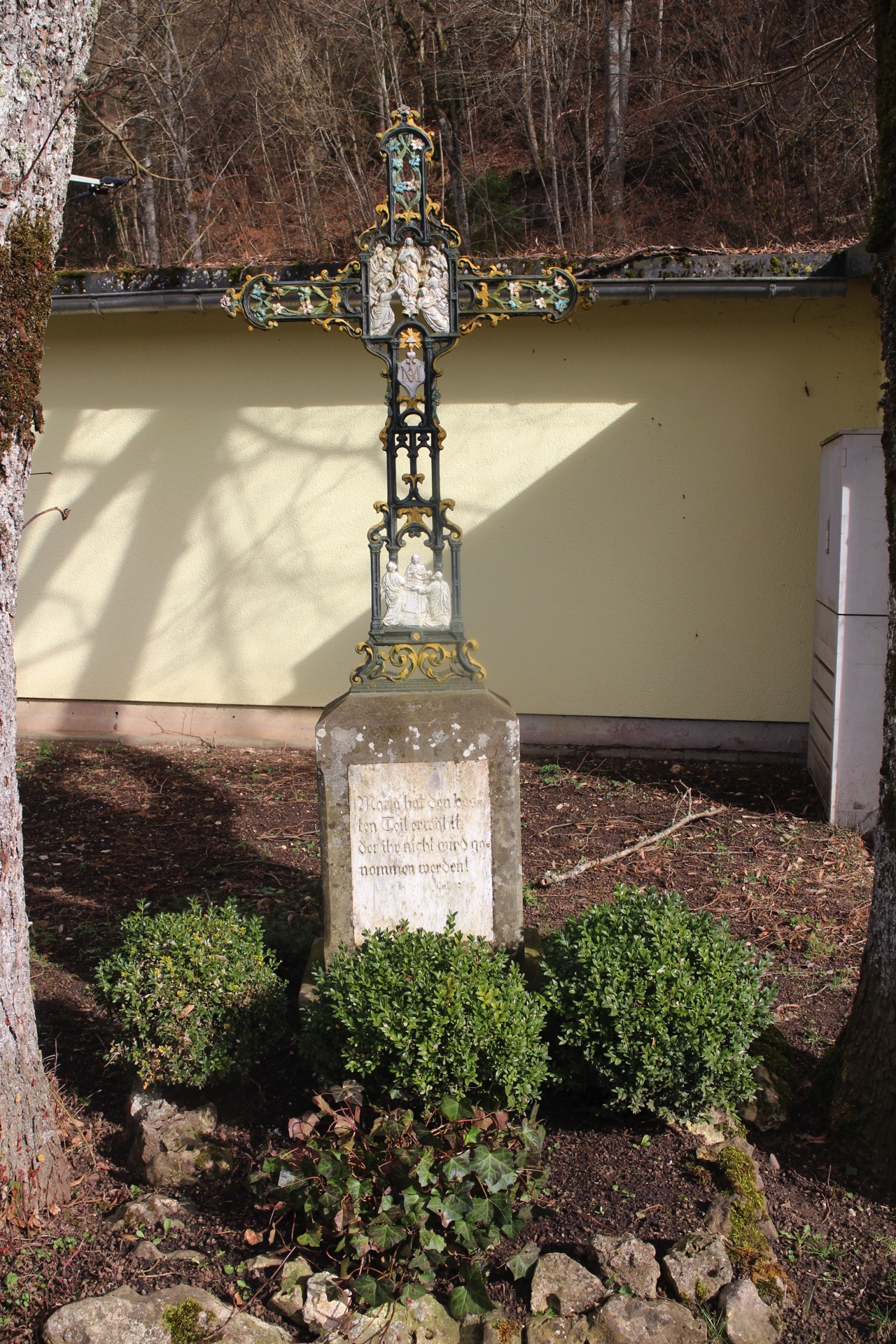 Bei dem reich verzierten Kreuz handelt es sich um eine bemerkenswerte fabrikmäßig hergestellte Gusseisenware, die wohl aus den späten 1890er Jahren stammen dürfte. Die Inschrift auf der Marmortafel im Steinsockel aus grünem Sandstein lautet: